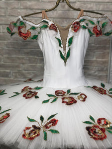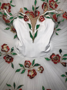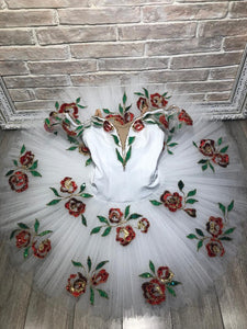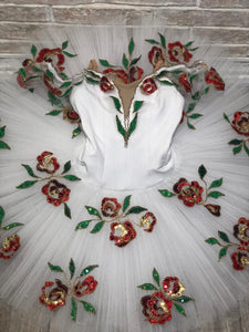 The professional, slightly bell shaped tutu skirt is white, and embellished with the same flower appliques. Hoops inserted, ruffled panties.