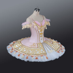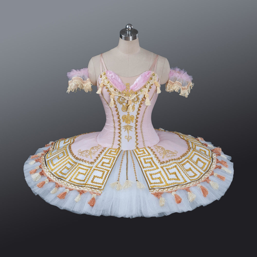 This pale pink and gold costume is created according the classical tradition. It features a panelled semi-stretchy pink bodice, with a center white long insert, gold decorations, appliques, trims and small bows. Little arms bands are also part of this costume.