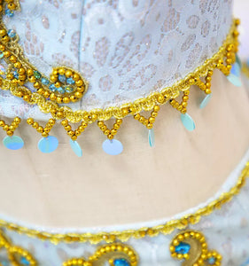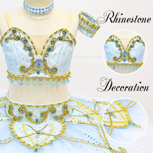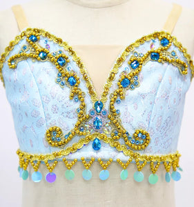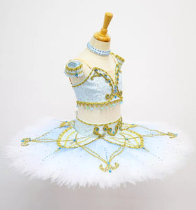 This two piece professional tutu features an amazing shade of pale blue and gorgeous gold decorations.