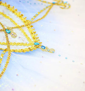 The tank top bodice is richly decorated with gold appliques and blue stones. The bell-shaped professional tutu skirt has an embroidered waist band, while the rest of the skirt is embellished with gold appliques, stones, as well as golden trims.