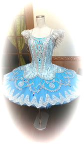 The bell-shaped tutu is more than a masterpiece. Made of ten layers of high quality sky blue net, it features a brocade tutu skirt, silver appliques, lace, silver trims and crystals.