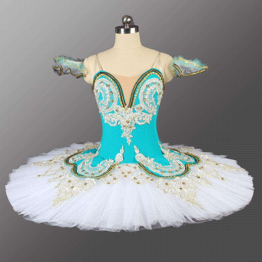 The aqua bodice is made with high quality satin, and features one of the richest decorations in all our Collection.  There are silver trims and appliques that make the bodice of this tutu really unique, as well as hundreds of sparkles and crystals. The bodice also features a deep V in the front with nude mesh insert, and fastens in the back with a double row of hooks and eyes.