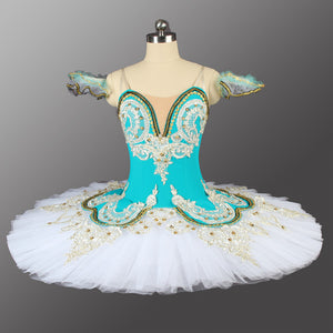 The tutu skirt is made with matching aqua tulle,, and is richly embellished all around, with appliques, trims, and crystals.