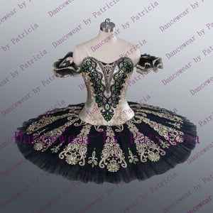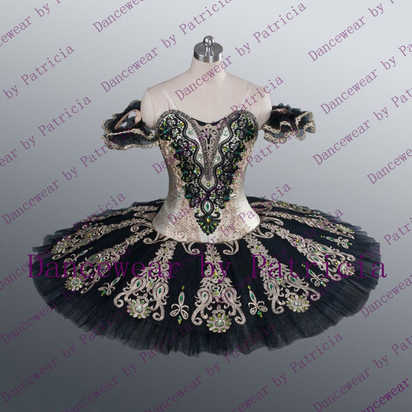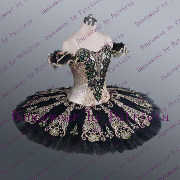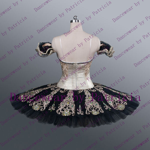 The professional, 12 layers tutu skirt is beige, with an overlay of black tulle. The tutu skirt is richly and lavishly decorated with long bands of dark gold appliques, and crystals.