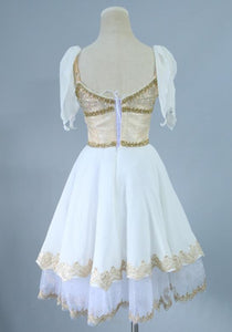This professional ballet dress, has been made according to the classical ballet tradition. The golden beige bodice is richly decorated in gold and silver, with multiple crystals to give extra shine on stage. Two white chiffon scarves are attached to the nude straps.