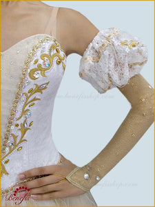 The sleeves are made in the shape of guipure sleeve - puffs with attached closely fitting gloves of the thin semi-stretch mesh fabric with sparkling accents. There are elastic loops on the gloves for fingers.