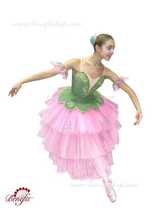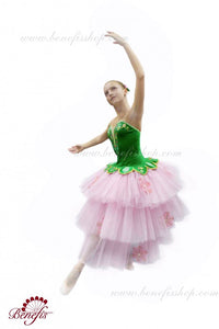 Green bodice is made of the semi-stretched fabric. It has a flesh-colored inset on the chest and elastic straps.
