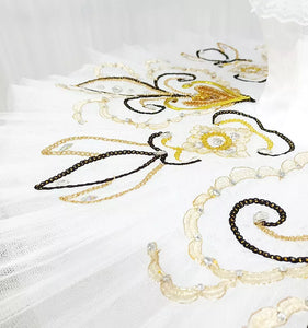 The professional tutu skirt is created with high quality white tulle,  and features dark gold embellishments, black shiny sequins and crystals.