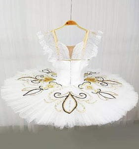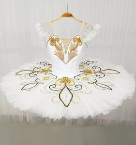 The bodice of this stunning white tutu has been created using white, high quality shiny fabric, and is richly decorated with gold appliques, and sequins. The bodice has a deep front V and the little sheer cap sleeves are attached to the clear straps and decorated with white lace.