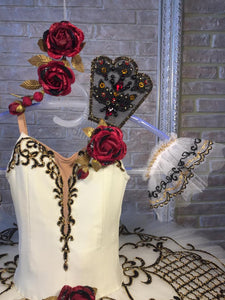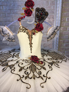 The ten layer, professional, hooped ballet skirt is entirely decorated with black and gold appliques, plus a red rose sewn on the waist line.