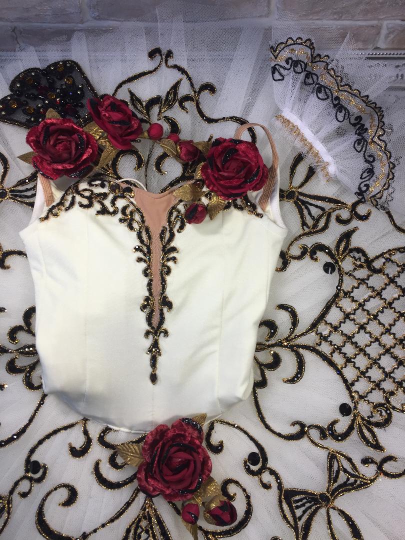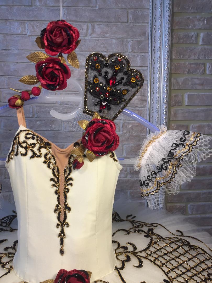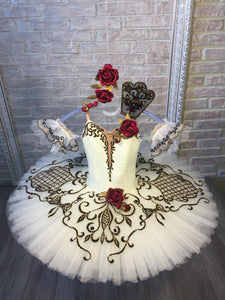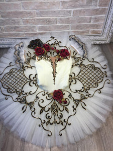 Paquita professional Russian tutu, entirely hand made and decorated. The bodice is made of special semi stretchy fabric, and features a deep V cut in the front, with nude insert. The decoration is made with gold appliques, and one red rose is sewn on one side of the chest.