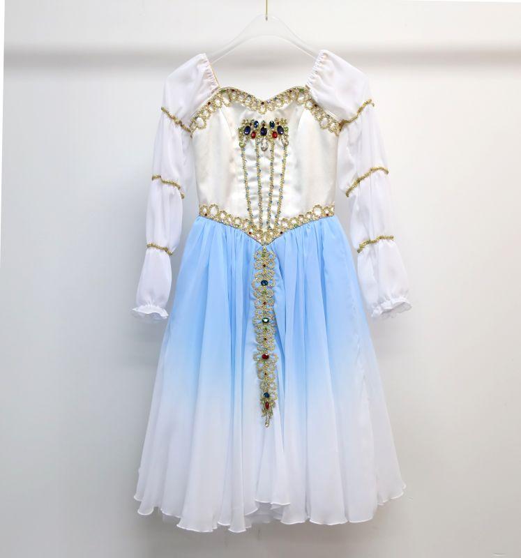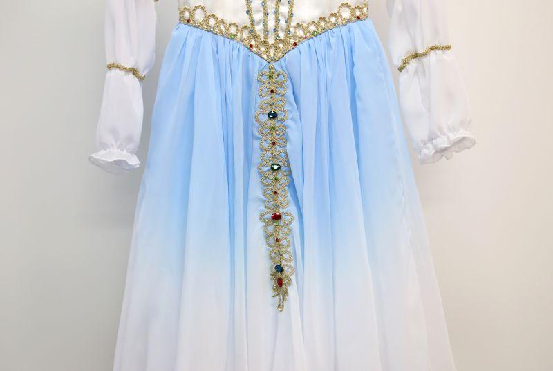 This enchanting, medieval style ballet dress, features a white satin top part, and a chiffon, knee-length skirt with fading tones of blue. This costume features long white, chiffon sleeves with golden trims decorations, while the top part is richly decorated in gold and with multi colored crystals. Th pale blue, ombre' chiffon skirt, is embellished with a long vertical gold applique', decorated with crystals.