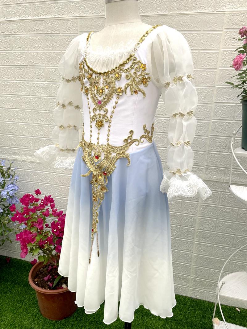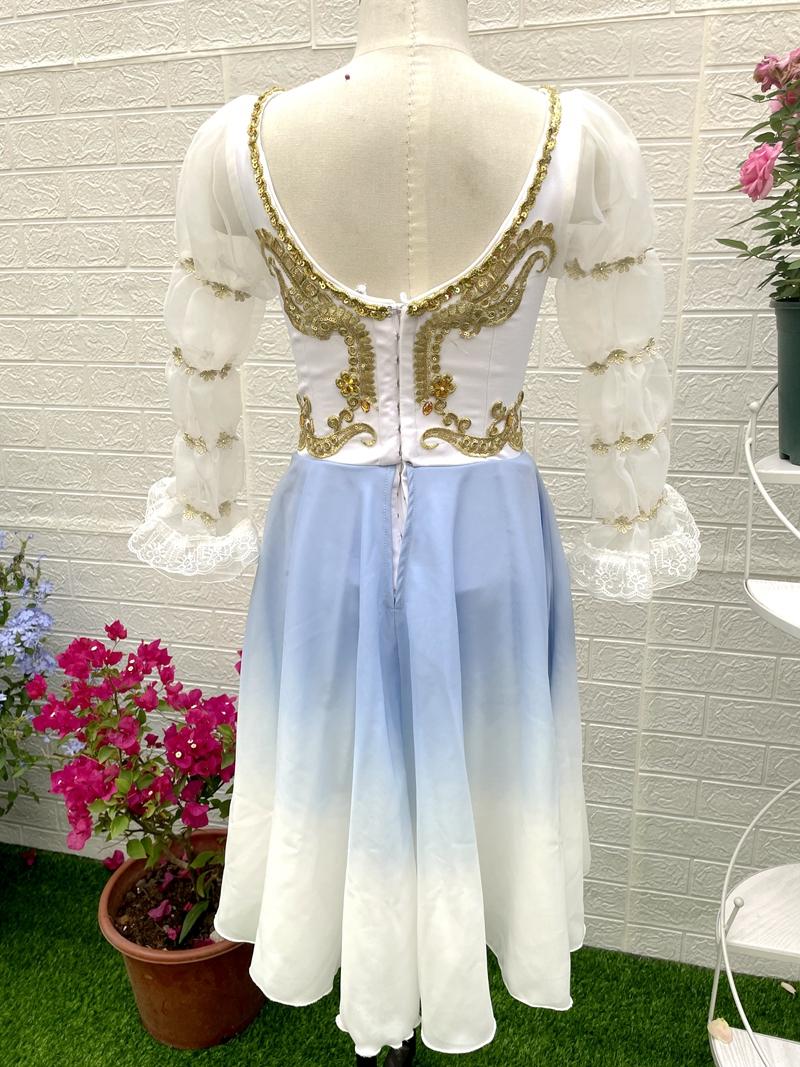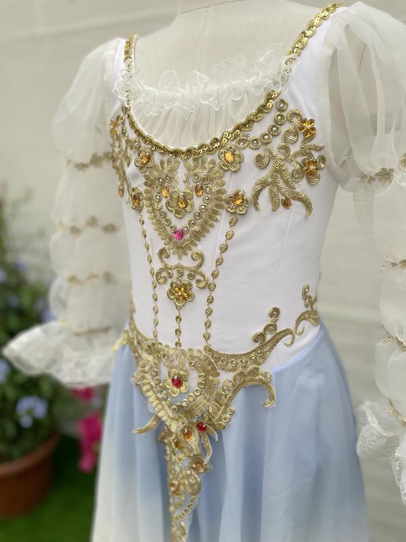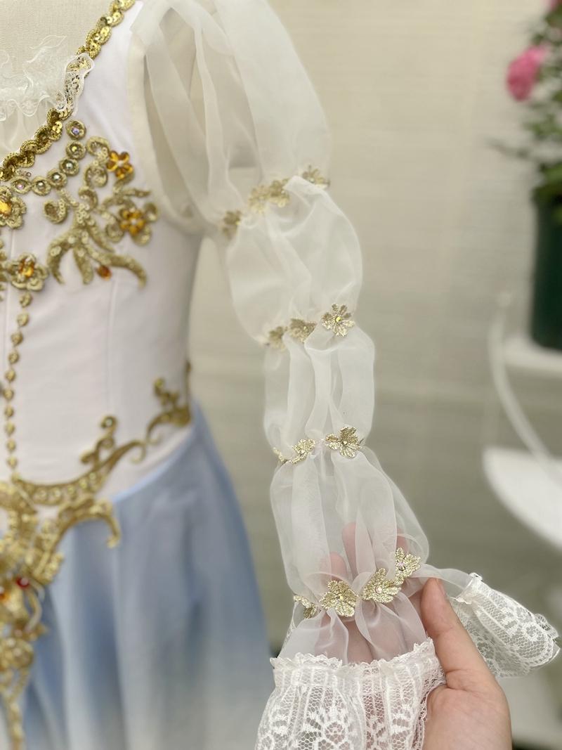New creation for the "Pas de Trois" in Swan Lake. This amazing ombre' dyed stage costume features fading tones of sky blue over white. The top of the dress is entirely white, with extremely rich gold decoration and crystals, and the long chiffon sleeves are embellished with gold trims.