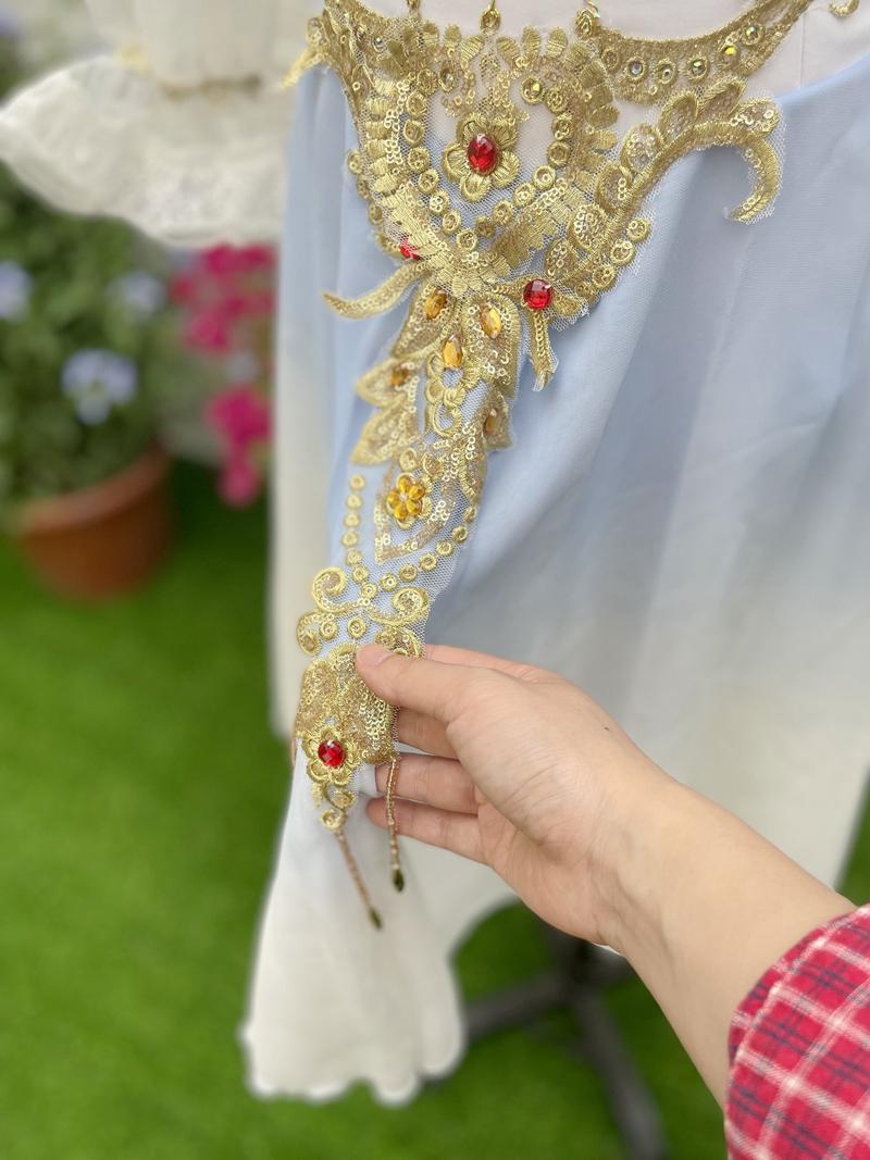 The knee-length chiffon skirt is ombre' dyes and features gradient tones of pale sky blue. There is a rich embroidered belt that gives the costume a real royal look. The back of the costume is oval and is also entirely decorated.