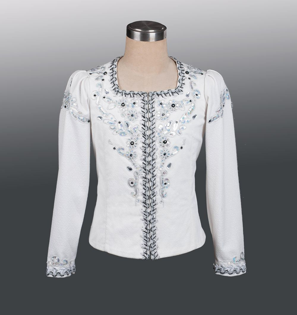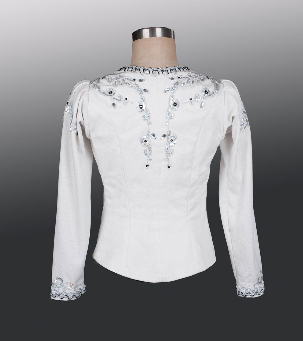Professional male tunic suitable for Prince Desire' in the Sleeping Beauty but also for other roles, like Jean de Brienne in Raymonda and many other male roles. The top is made using high quality semi-stretchy white fabric and features a square neck. Very rich decoration made using all sorts of silver trims, sequins, silver and black stones and sparkles.