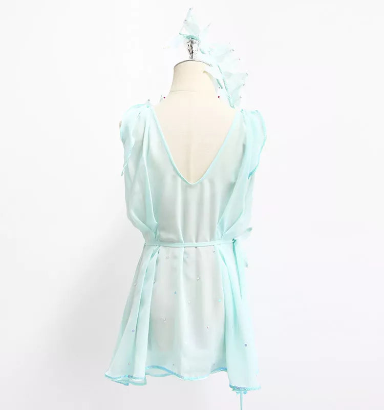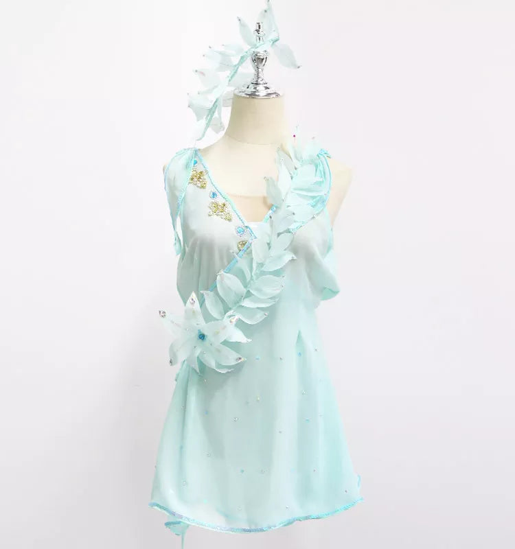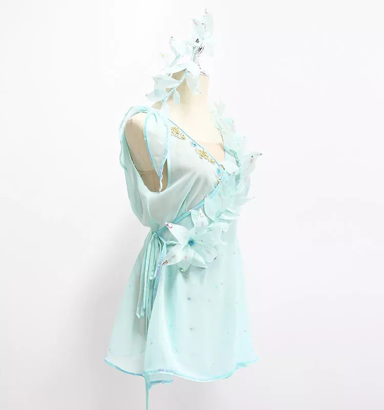 This crossed pattern, minty blue short dress is made with chiffon, and is decorated with aqua blue shiny sequins, gold appliques, blue and clear crystals, and an impressive trail of flowers across the chest. The same flowers are also included in form of headpiece.