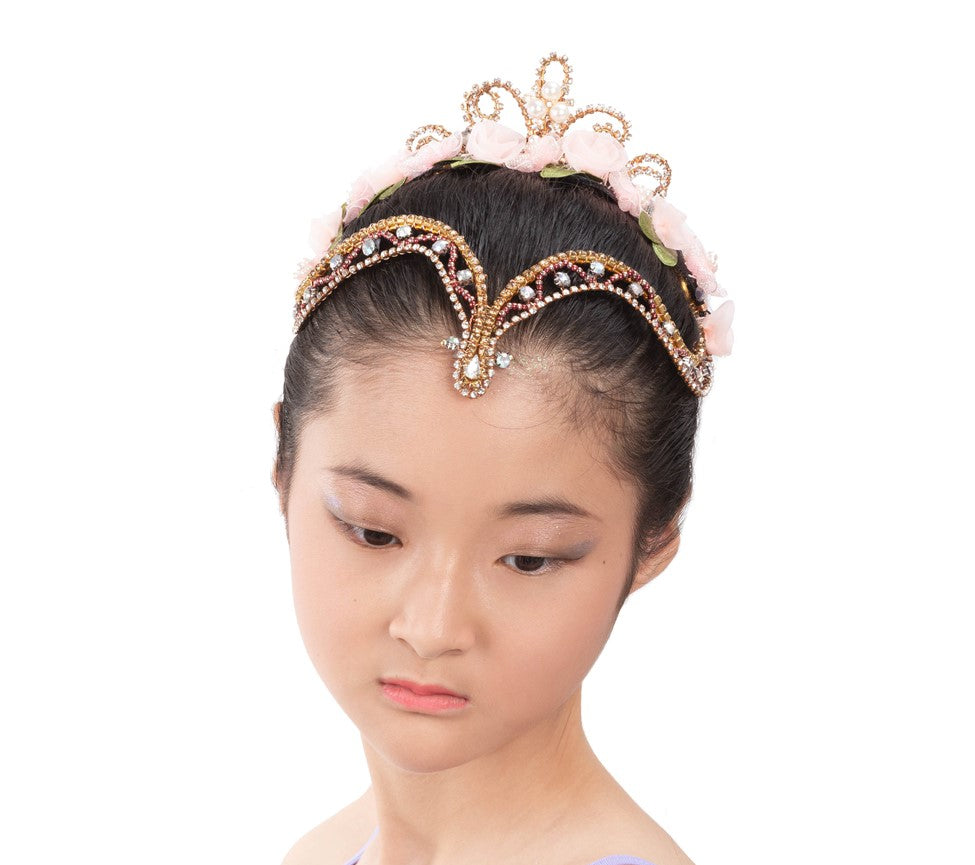 This tiara is entirely hand made using crystals, rhinestones, pearls and pastel flowers. Suitable for the role of Dulcinea or any other classical variation.