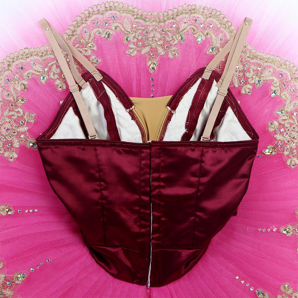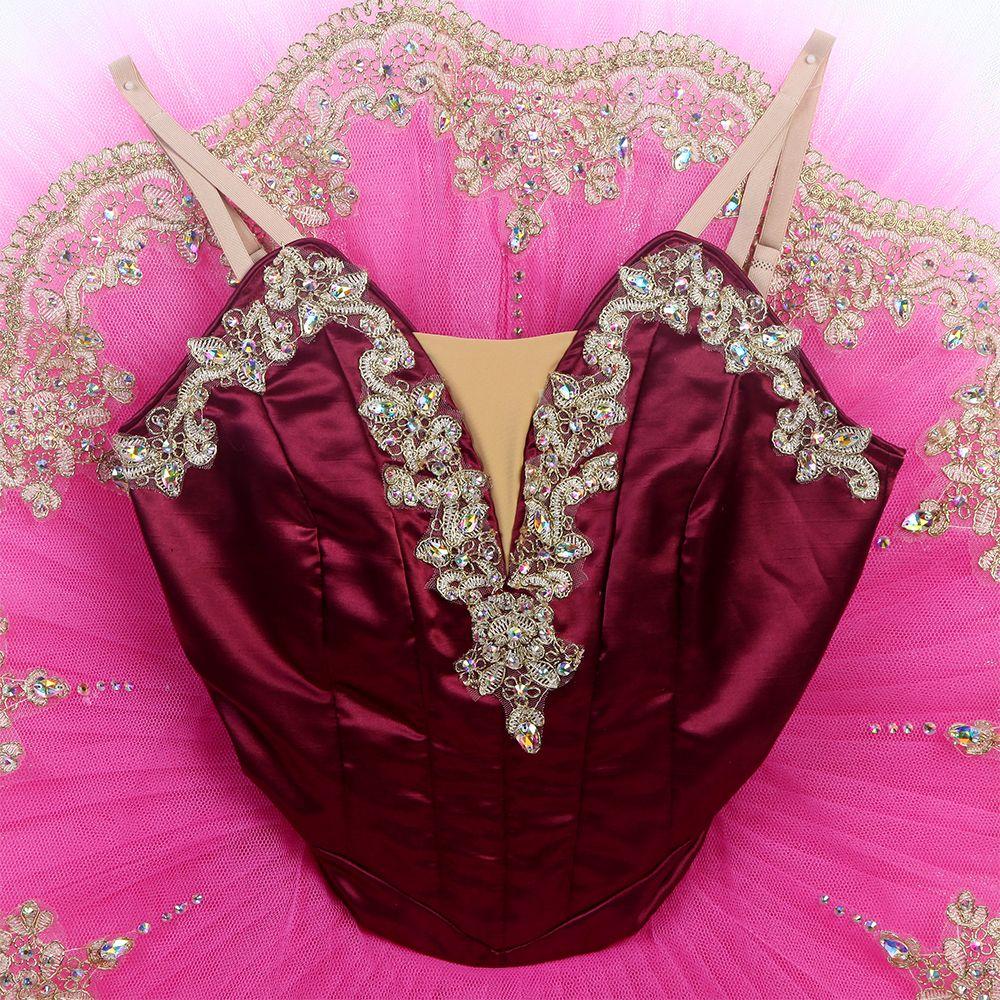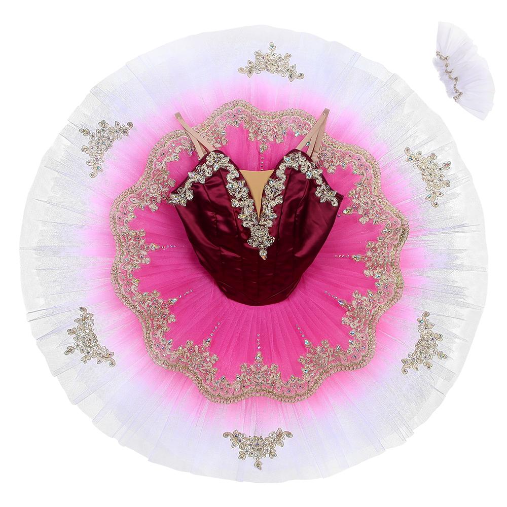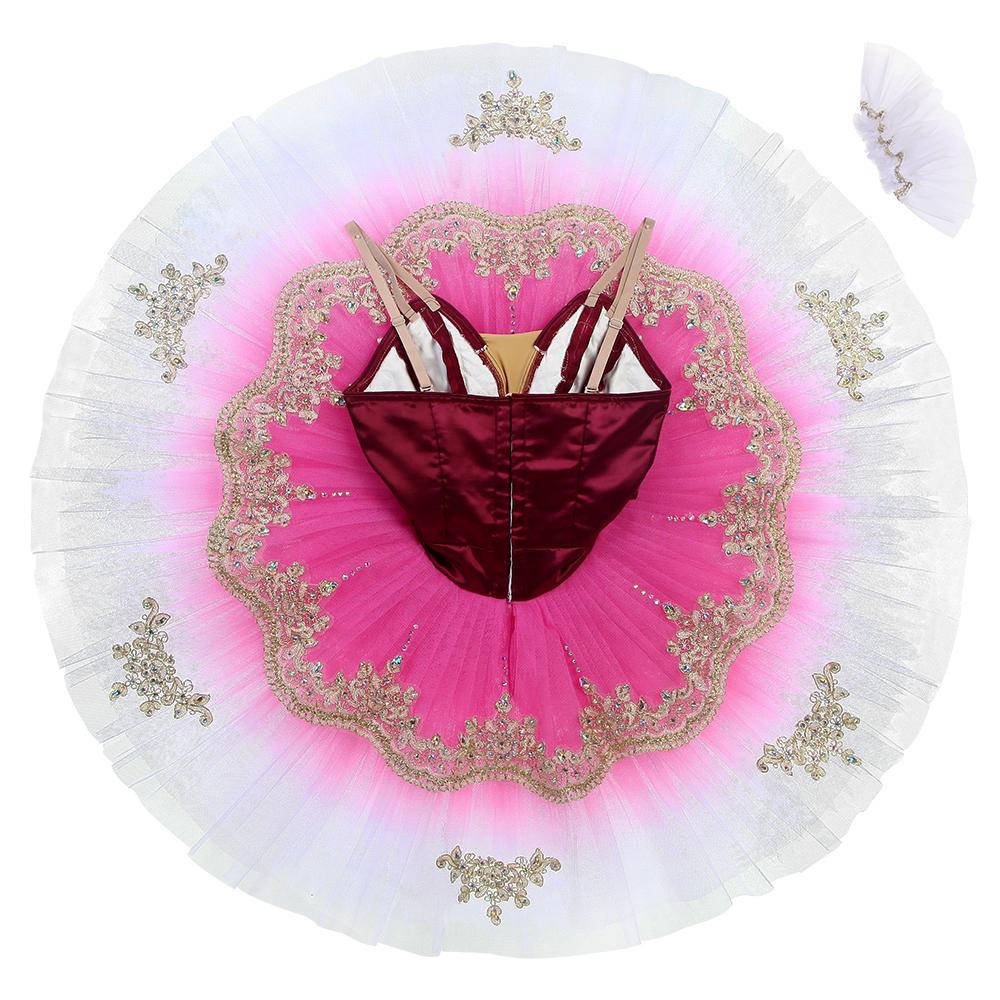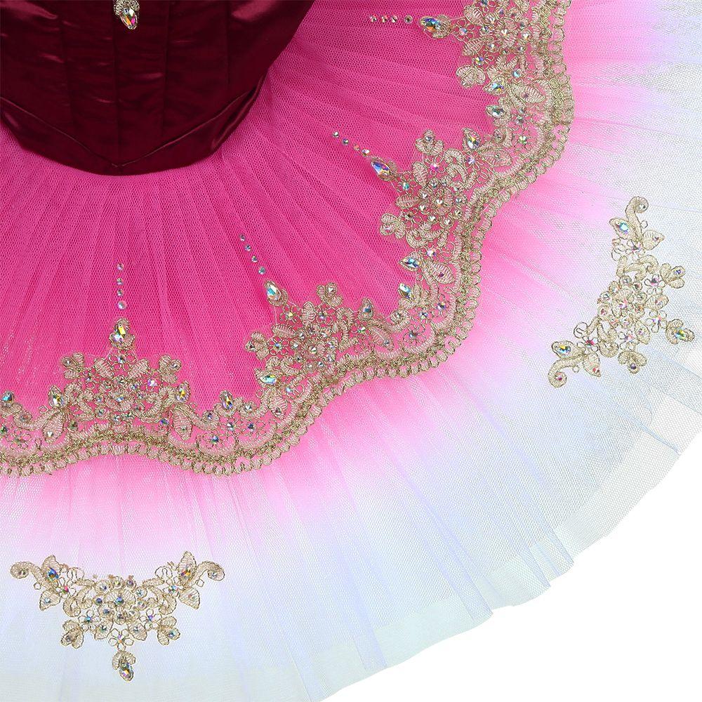 The 12 layers, ombre' dyed professional tutu skirt, features gradient shades of deep plum pink, fading to white. The tutu skirt is decorated with golden trims, appliques and sparkles.