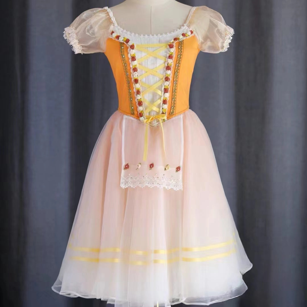 The professional, Romantic tutu skirt is white with gradient tones of apricot. White organza overlay with a little apron decorated with little flowers and trims.