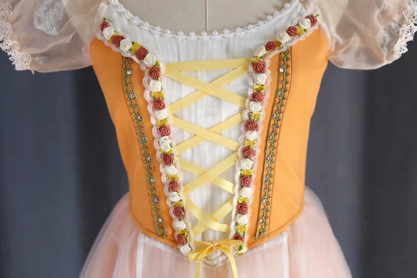 The tight fitted apricot bodice features a laced pattern and a whit undershirt, as well as floral decorations. Short white sleeves. Back closure with a double row of hooks and eyes.