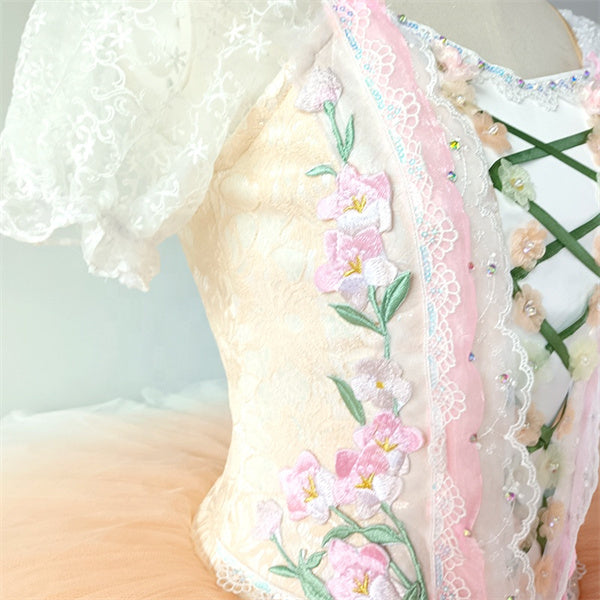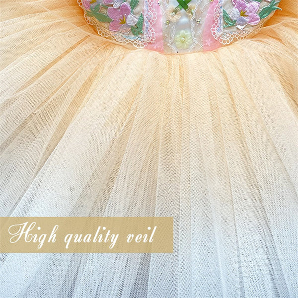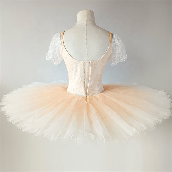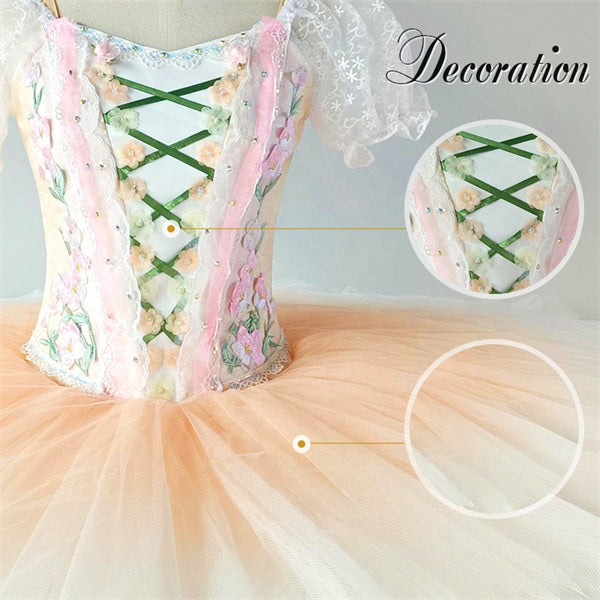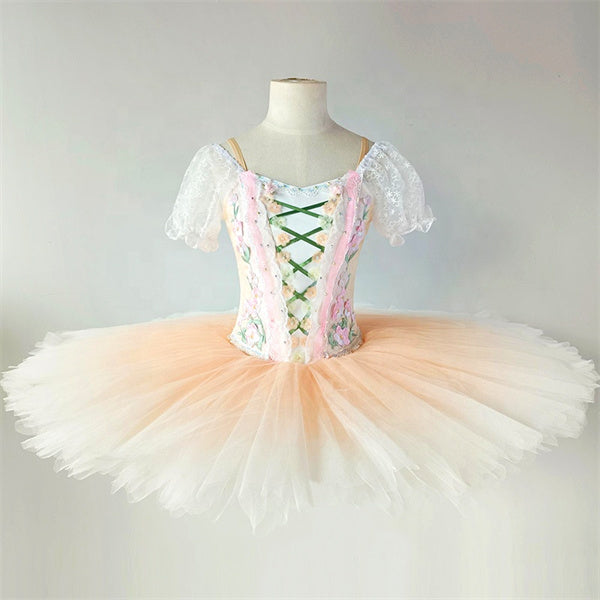One of our newest styles for the role of Coppelia. This professional, pancake peasant tutu features a peach bodice entirely embroidered with flower appliques, sparkles, pink and white lace, and the typical laced pattern with white undershirt and short lace sleeves.