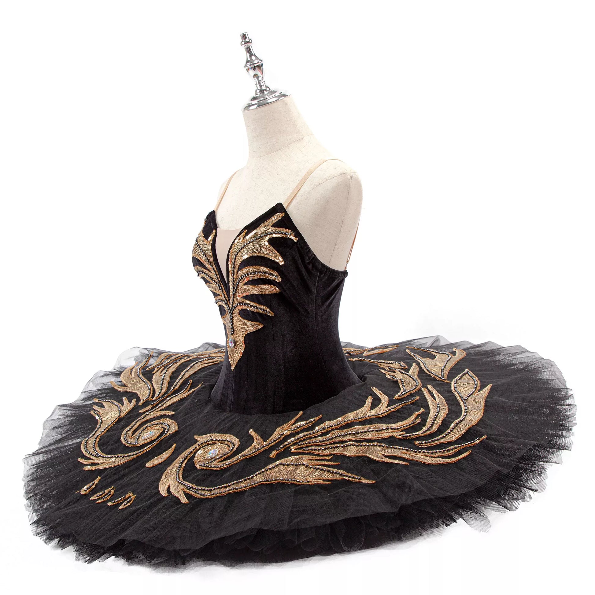 One of our most amazing Odile tutus. This Black Swan professional tutu will just eave the audience breathless. Entirely decorated in gold, and following a "swan pattern", this costume is just unique.