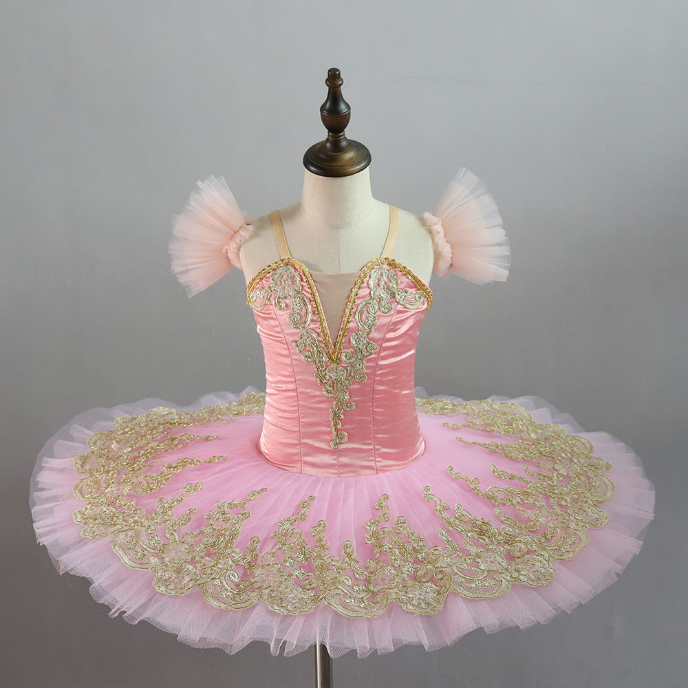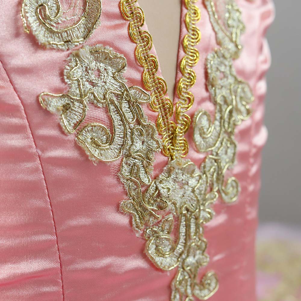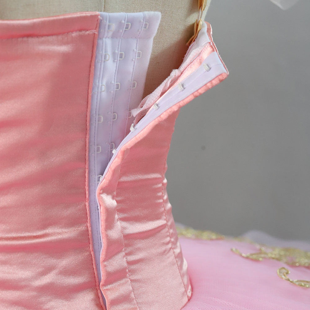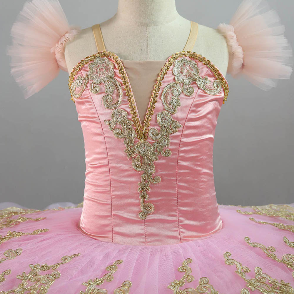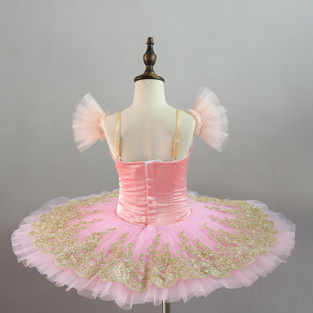 The pink, professional pancake skirt features very rich gold decoration with gold appliques in a vertical pattern.