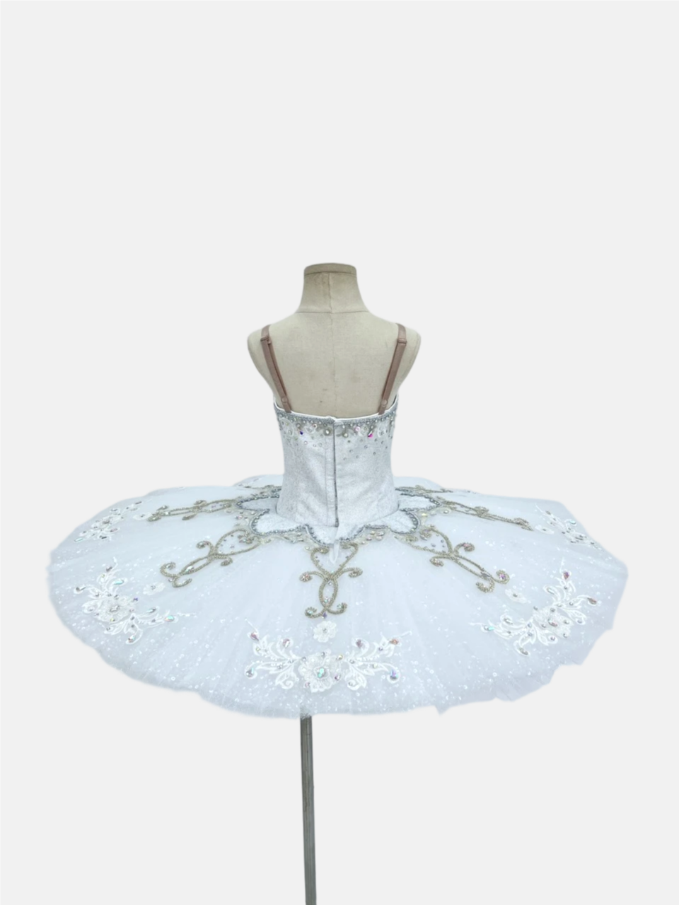 The professional, 12 layers pancake is skirt made with the finest English net, and is richly decorated with silver appliques and crystals of various colors. The top layer is created with sparkling, glittery tulle, to achieve extra shine.