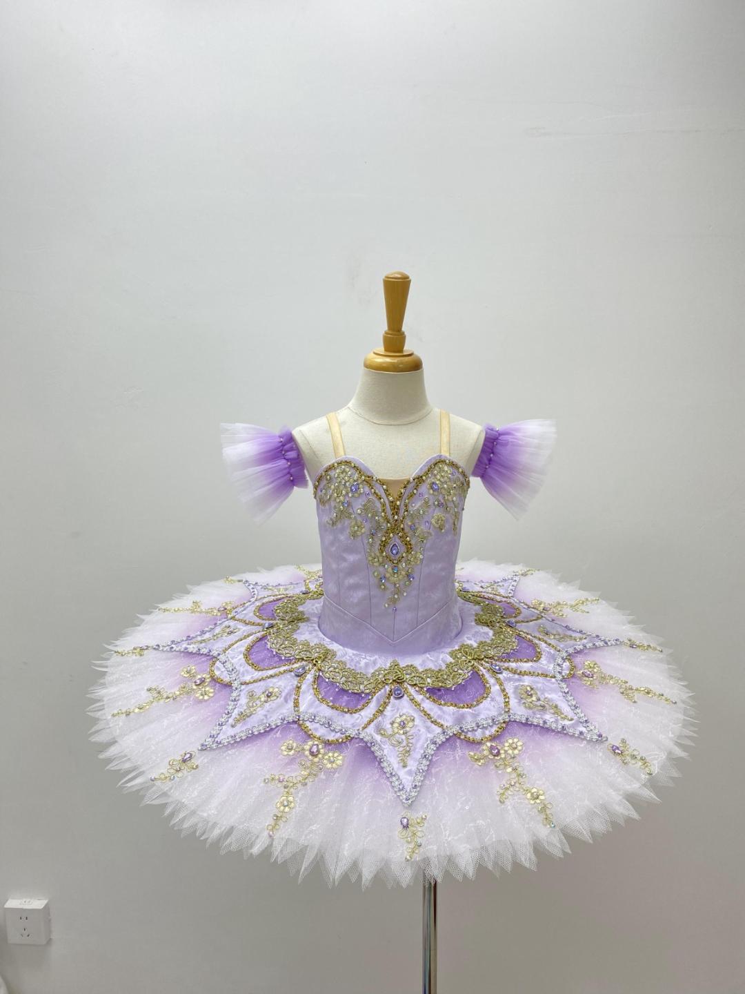 Professional Lilac Fairy tutu. Created with a beautiful shade of lilac, featuring a V-shaped shiny jaquard bodice, and rich decoration with golden appliques, trims and crystals.